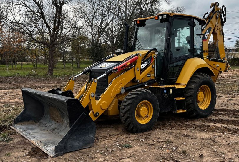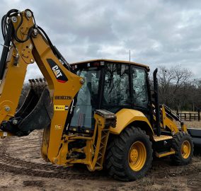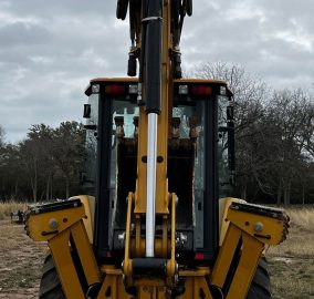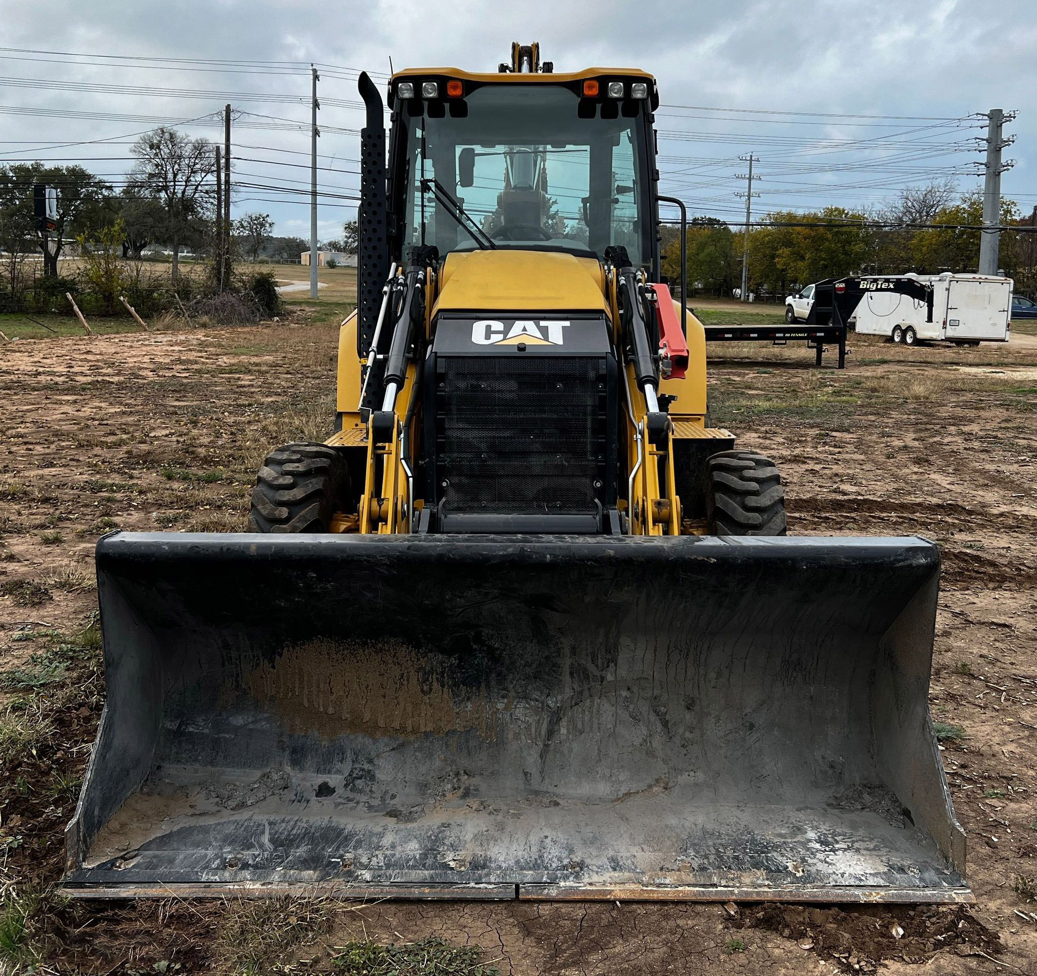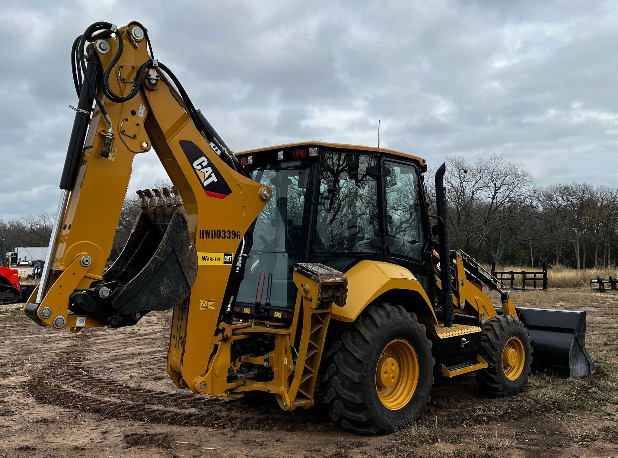 Versatile backhoe with hydraulic quick coupler, 1.5 cu.yd. bucket, and 24" Caterpillar backhoe bucket with 5 teeth. Features EROPS, A/C, heat, pilot controls, pattern changer, and auxiliary hydraulics. Equipped with 4WD, differential lock, and durable Goodyear tires for superior performance. Ideal for digging, loading, and lifting.